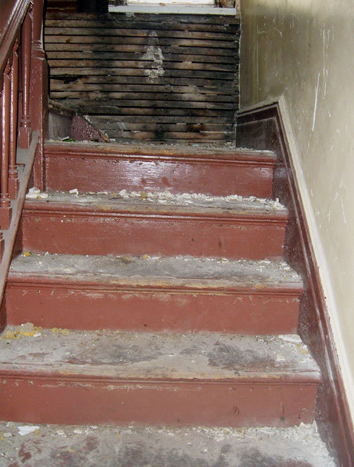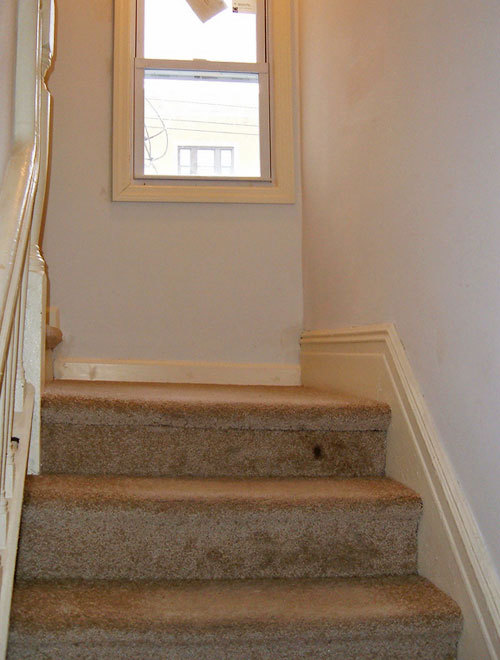 Stairs redone with carpet, walls repaired with sheet-rock.